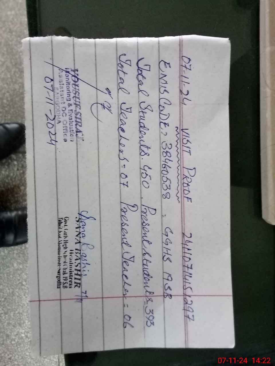 | Name: SA**** BA**** Designation: (School Headmaster's/Headmistress's) SST SCIENCE (HEADMISTRESS) Phone/Cell Number: 03**** |