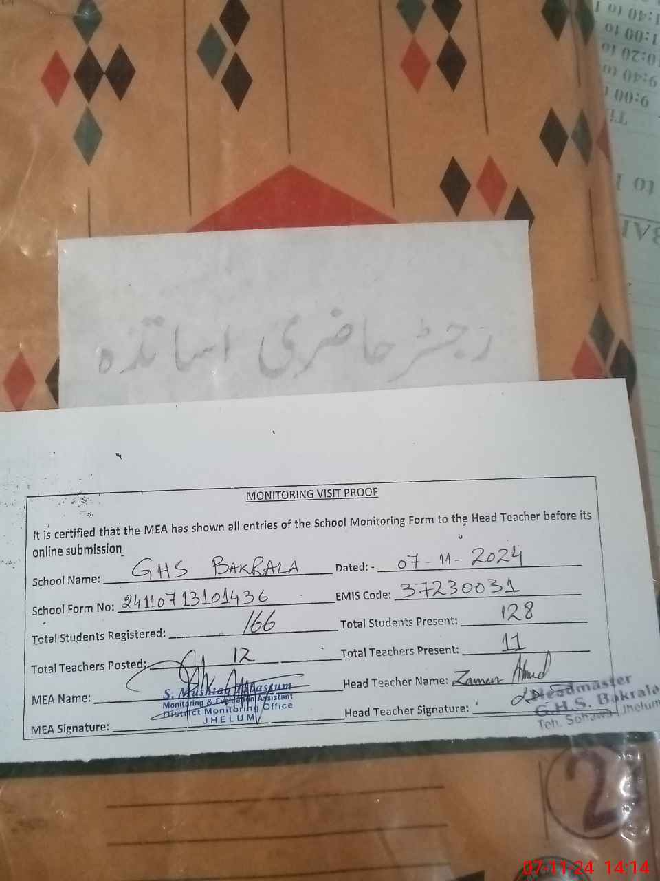 | Attendance Register | Head Teacher | MEA with School | Visit Proof |