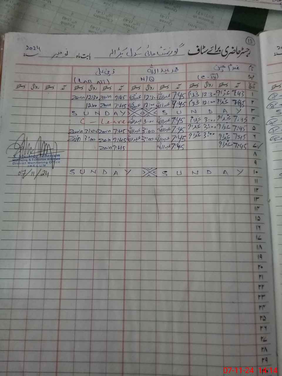 | CNIC | Full Name | Designation | R/C | Absence During Last Calender Month |