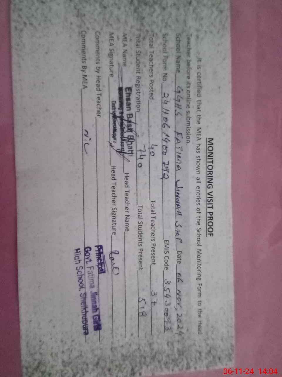 | EMIS Code: 35430093 | Name of School: GGHS FATIMA JINNAH SHEIKHUPURA | |||