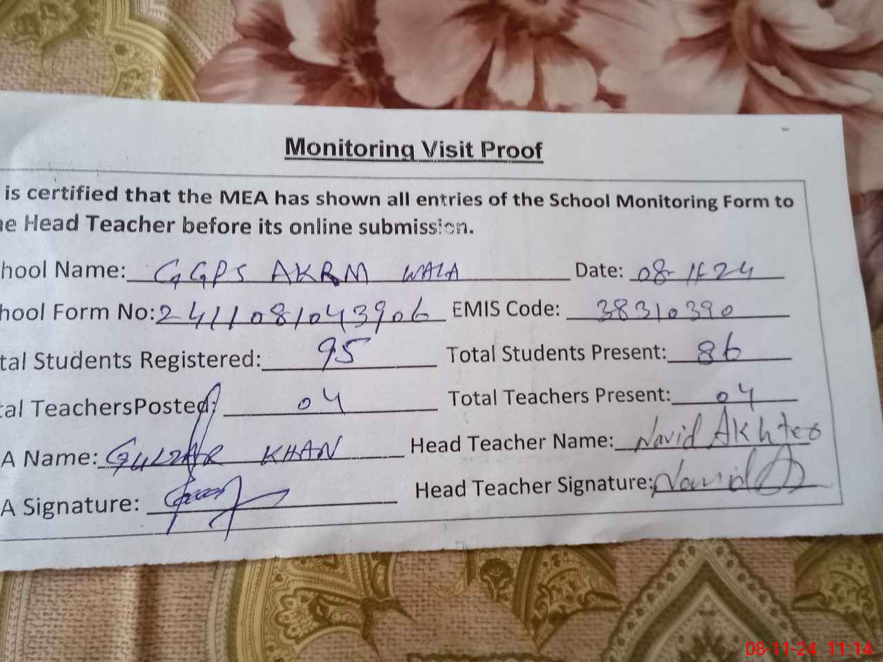 | Attendance Register | Head Teacher | MEA with School | Visit Proof |