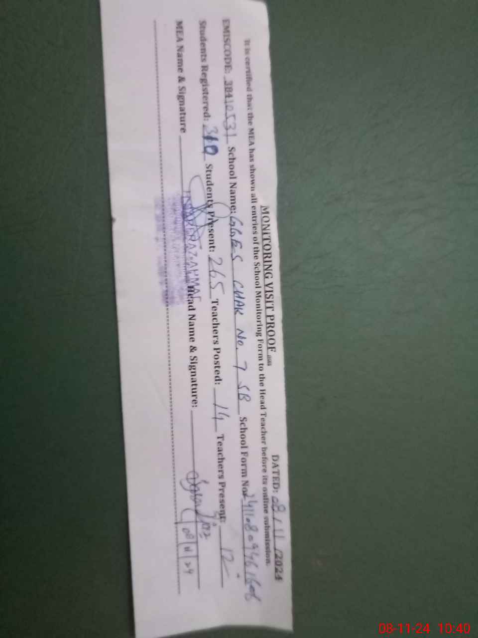 | Attendance Register | Head Teacher | MEA with School | Visit Proof |