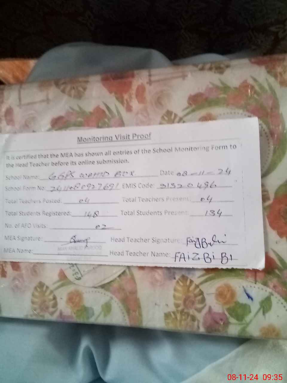 | Monitoring Date: 08-11-2024 | Start Time: 08-11-2024 08:57 AM | End Time: 08-11-2024 09:35 AM | Name of MEA: Kh**** Fa**** | |