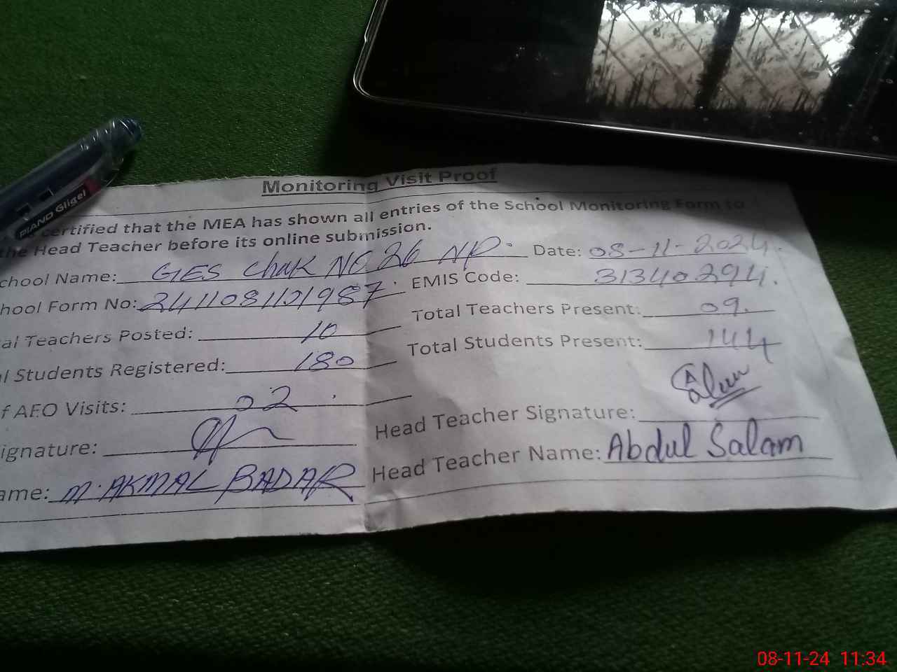 | Attendance Register | Head Teacher | MEA with School | Visit Proof |