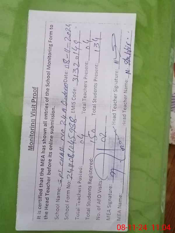 | Attendance Register | Head Teacher | MEA with School | Visit Proof |