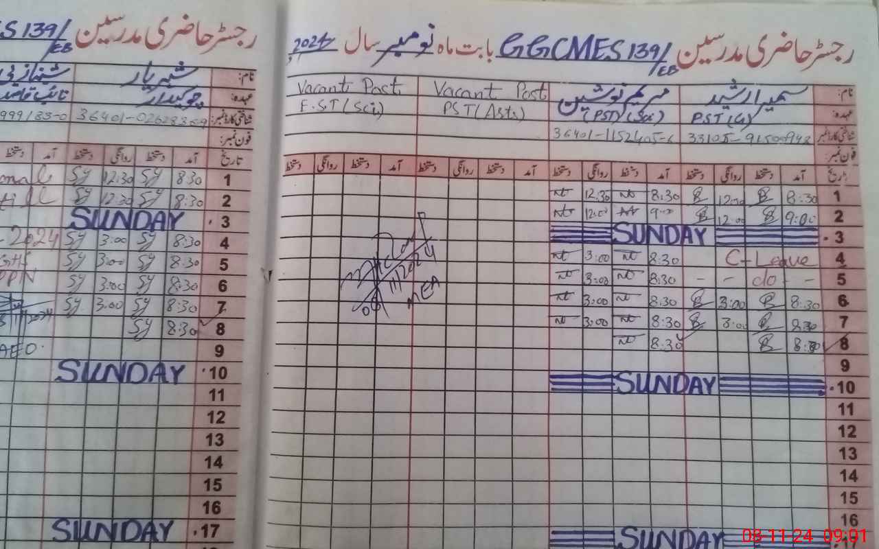 | CNIC | Full Name | Designation | R/C | Absence During Last Calender Month |