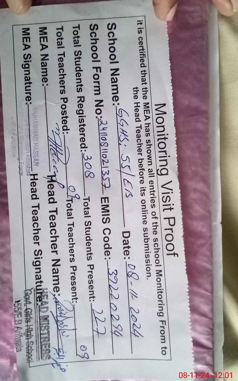 | Certified that this School was Inspected by the Undersigned MEA/DMO Today and the Information Stated Above is as Per Record. | |||||