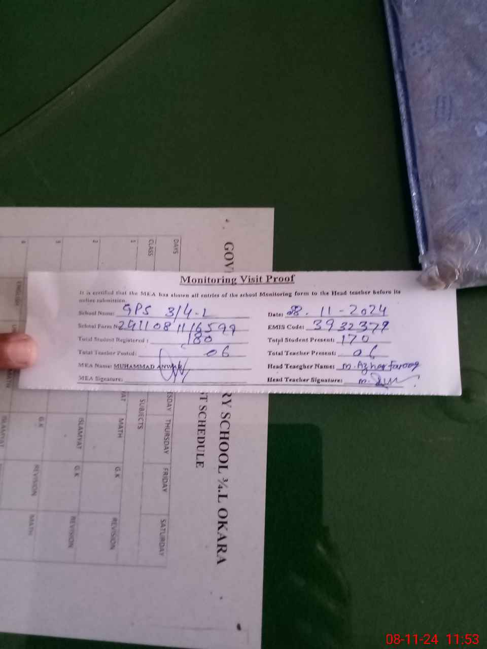 | Name: MAz**** Fa**** Designation: (School Headmaster's/Headmistress's) PTC/JV Phone/Cell Number: 03**** |
