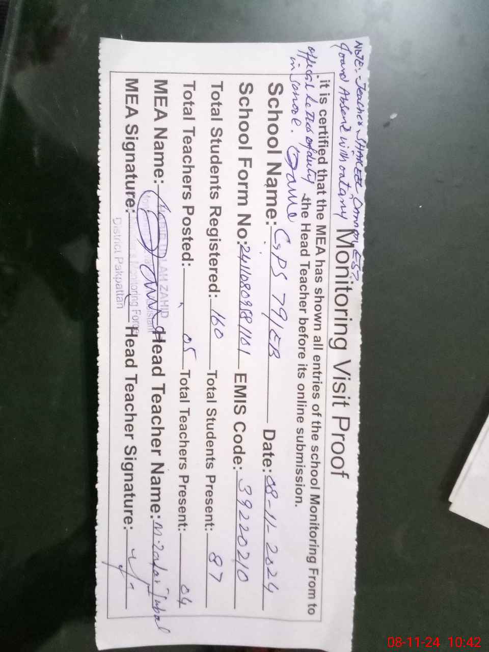 | Attendance Register | Head Teacher | MEA with School | Visit Proof |