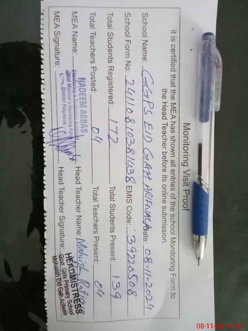 | EMIS Code: 39220508 | Name of School: GGPS EID GAH ARIFWALA | |||