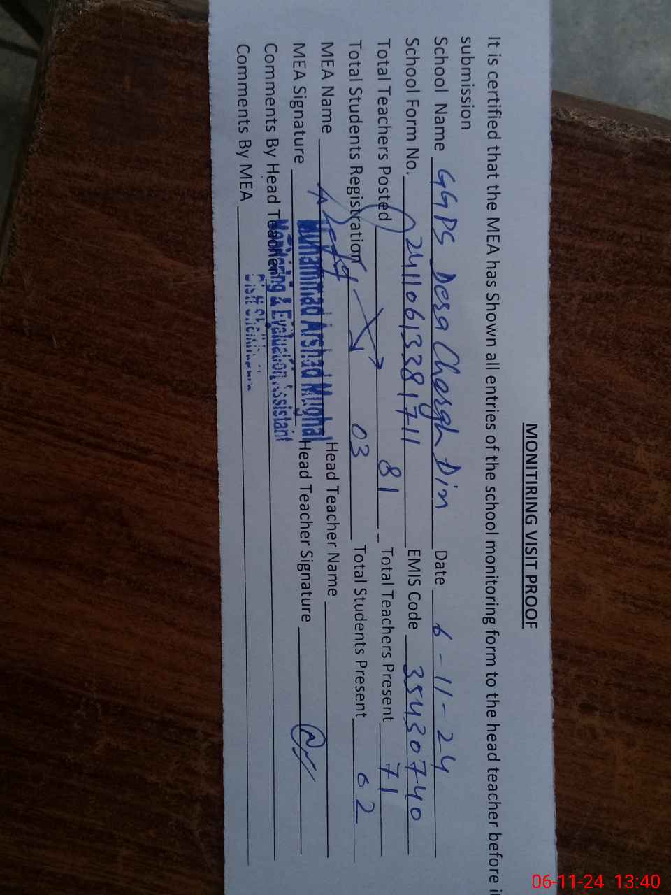| Attendance Register | Head Teacher | MEA with School | Visit Proof |