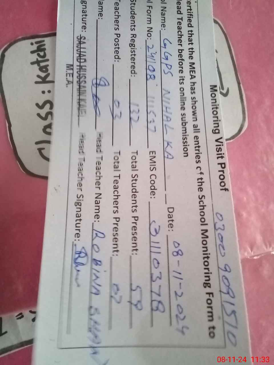 | Attendance Register | Head Teacher | MEA with School | Visit Proof |