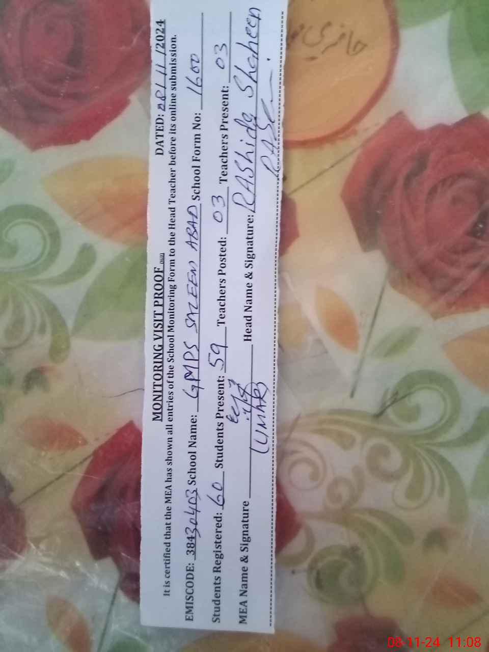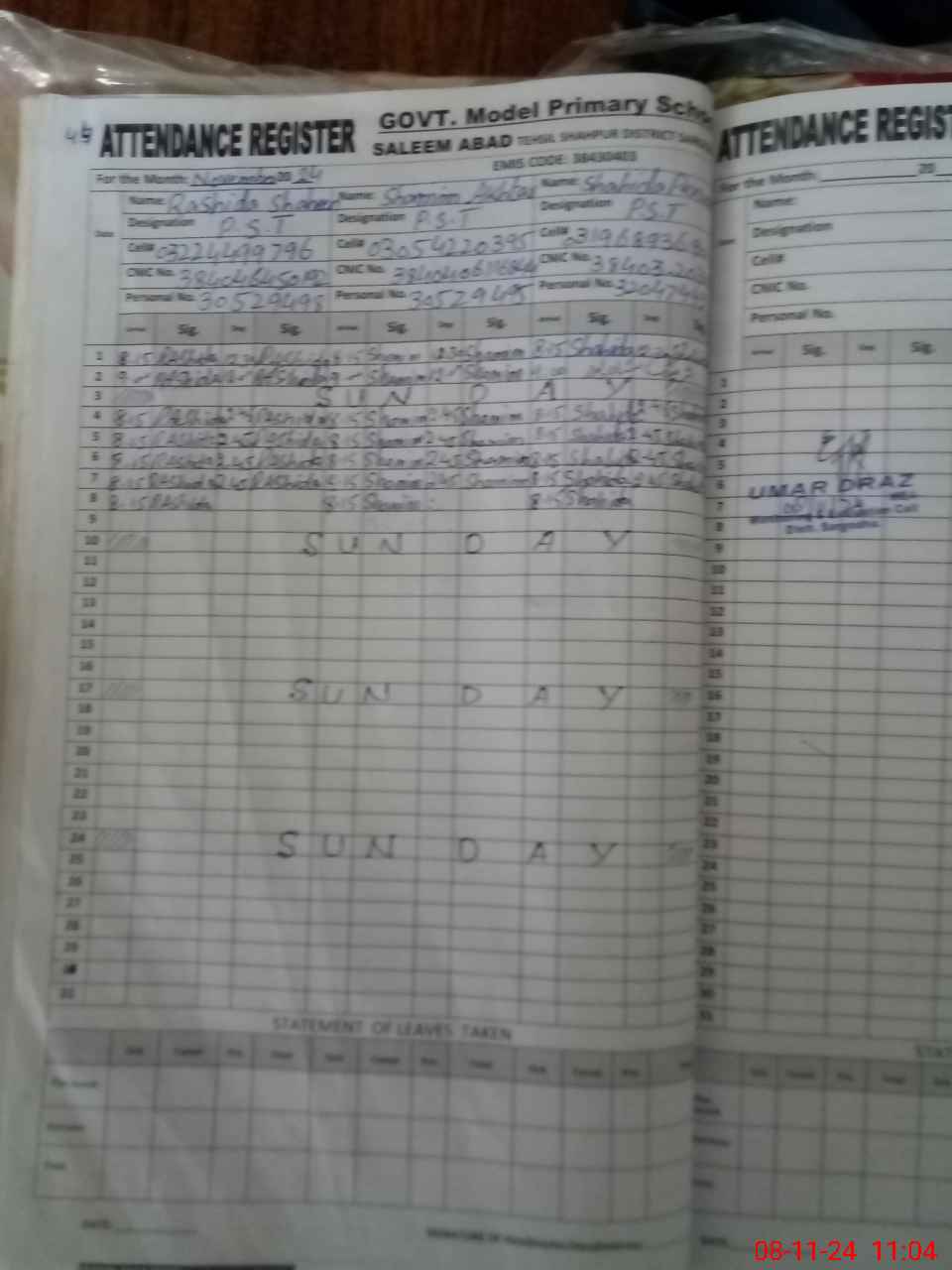 | Name: SH**** PA**** Designation: (School Headmaster's/Headmistress's) PST Phone/Cell Number: 03**** |