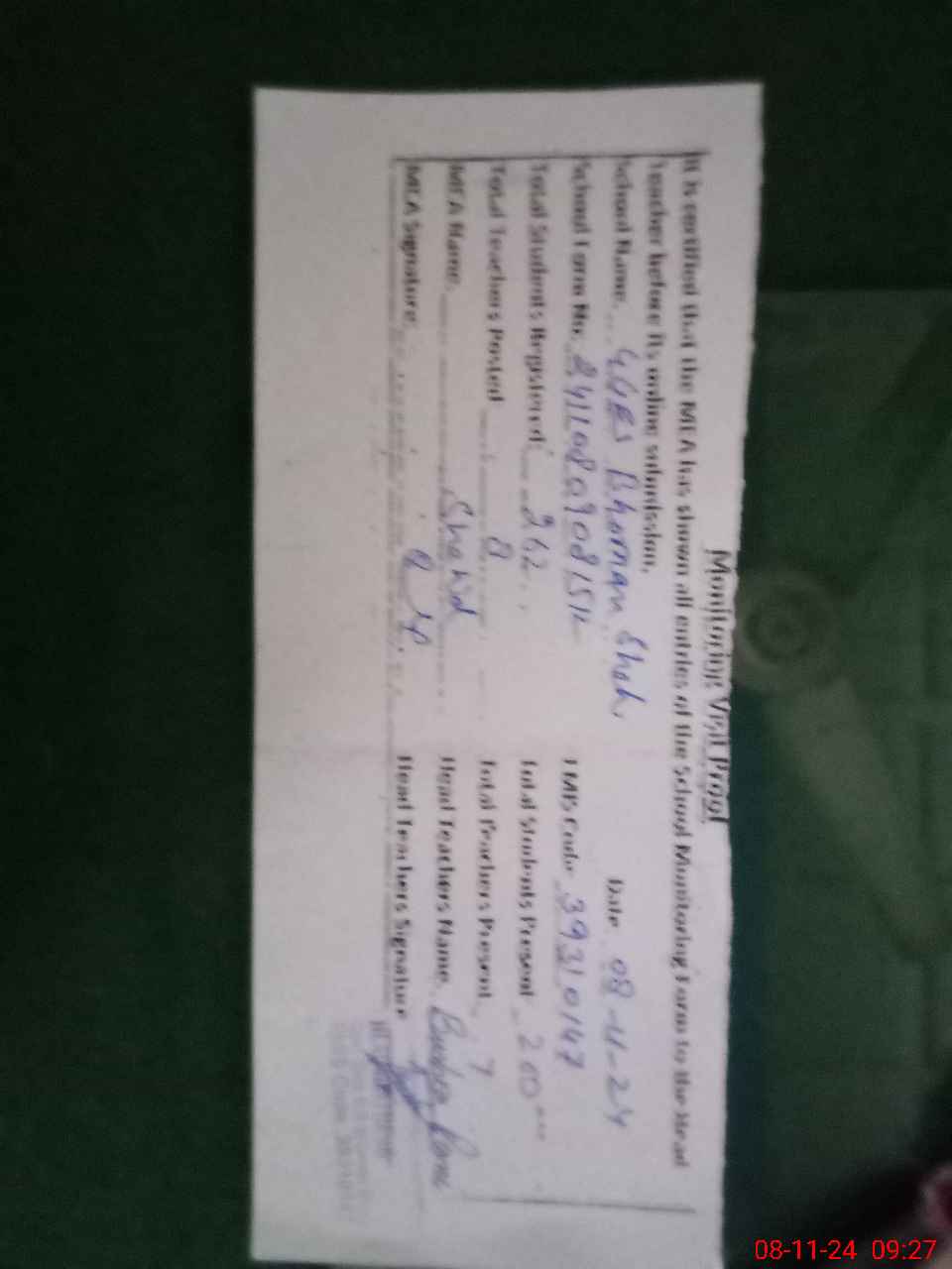 | Attendance Register | Head Teacher | MEA with School | Visit Proof |