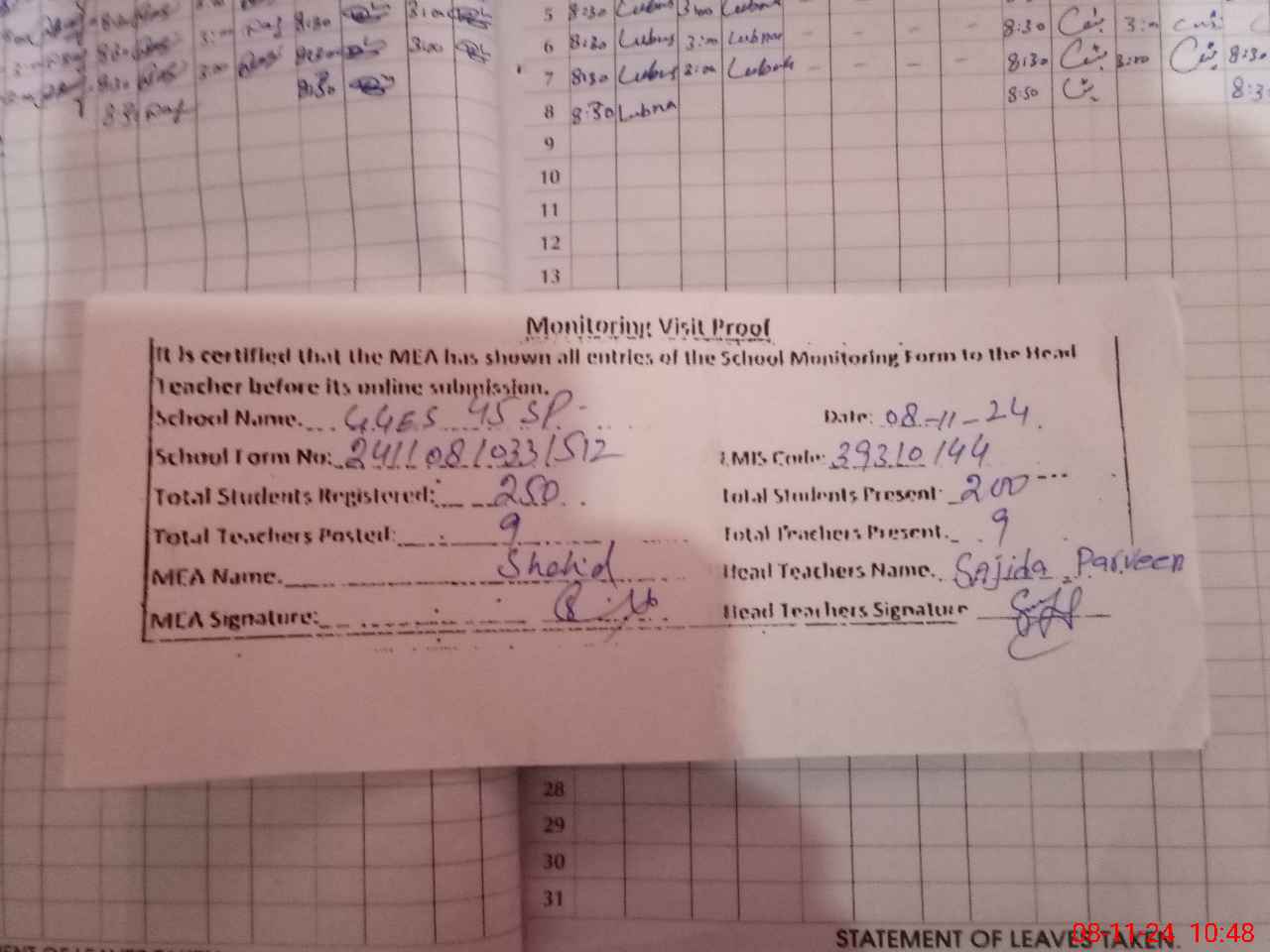 | Attendance Register | Head Teacher | MEA with School | Visit Proof |