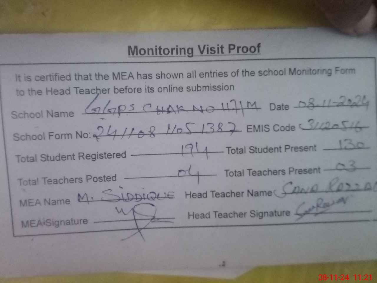 | Attendance Register | Head Teacher | MEA with School | Visit Proof |