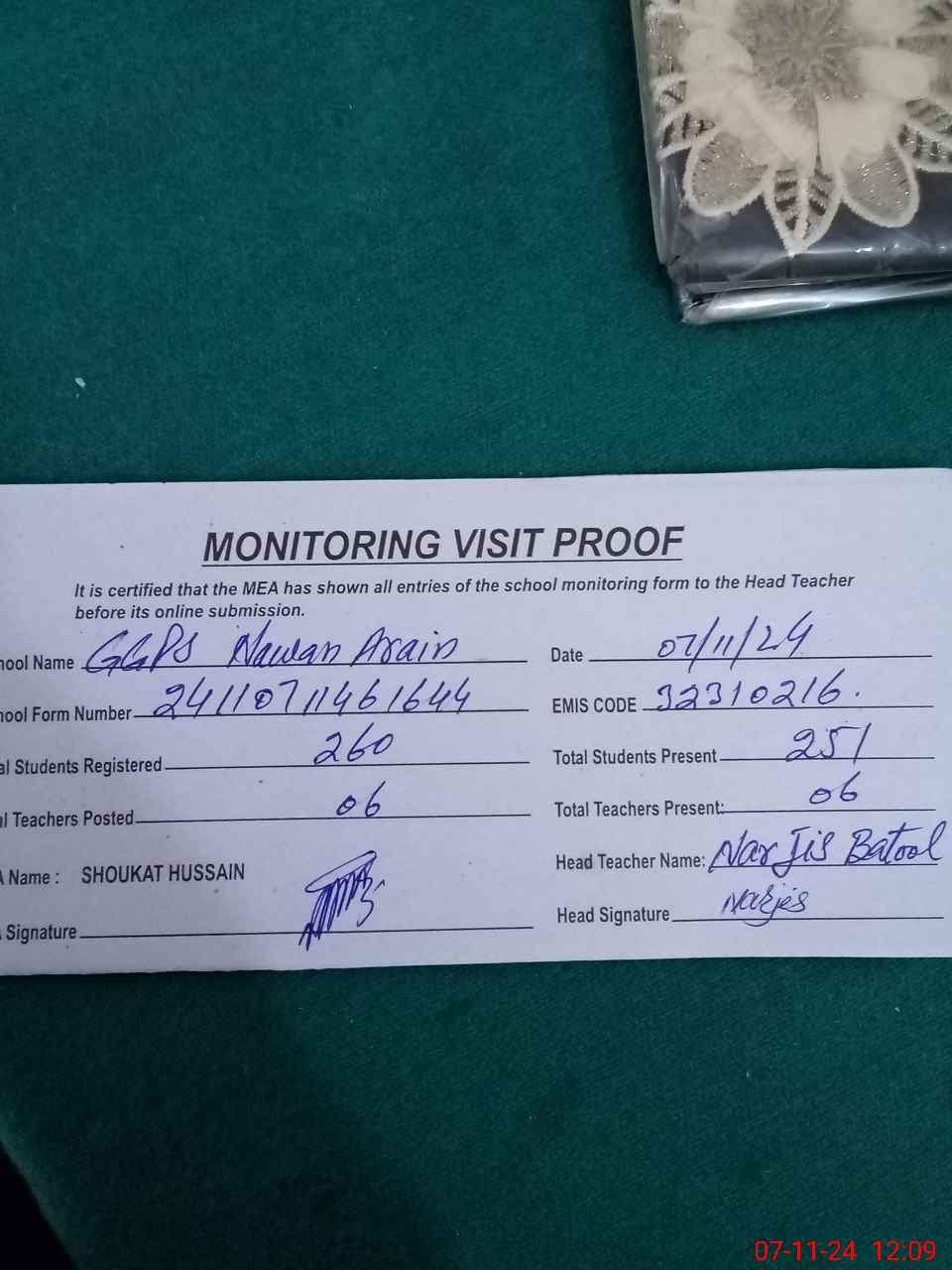 | Attendance Register | Head Teacher | MEA with School | Visit Proof |