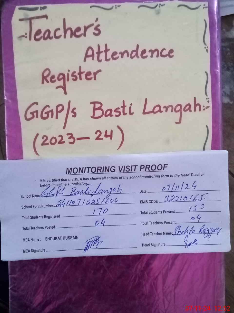 | Attendance Register | Head Teacher | MEA with School | Visit Proof |