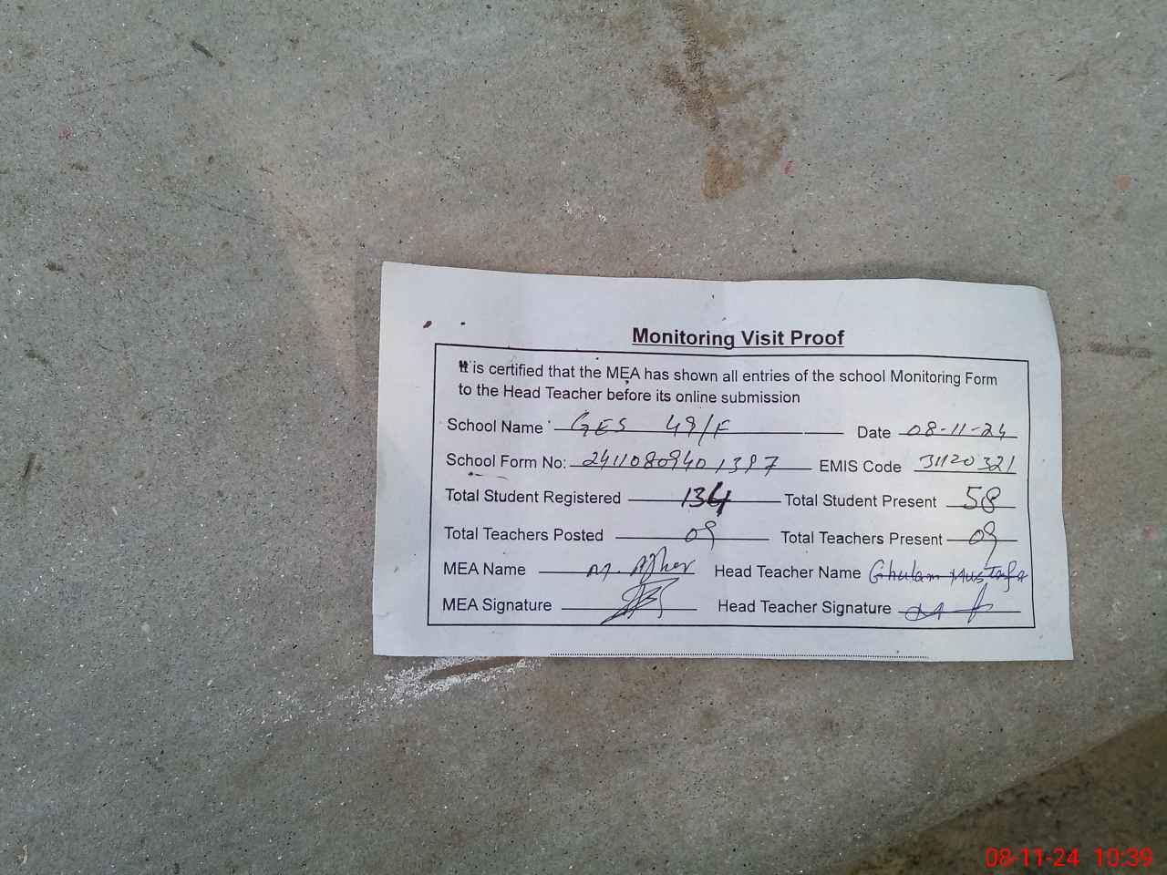 | Attendance Register | Head Teacher | MEA with School | Visit Proof |