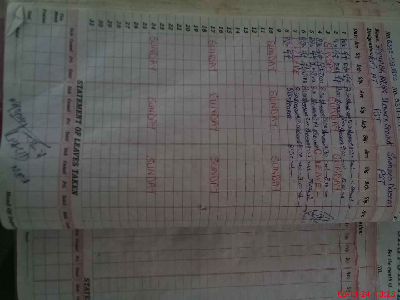 | CNIC | Full Name | Designation | R/C | Absence During Last Calender Month |