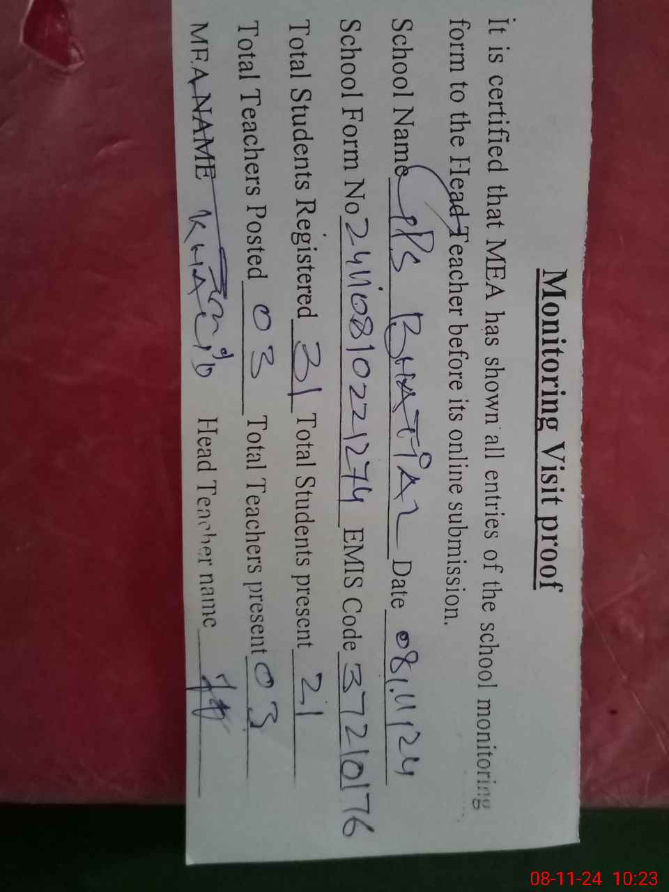 | Attendance Register | Head Teacher | MEA with School | Visit Proof |