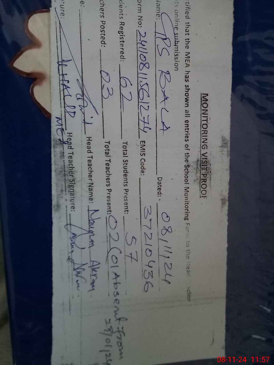 | Attendance Register | Head Teacher | MEA with School | Visit Proof |