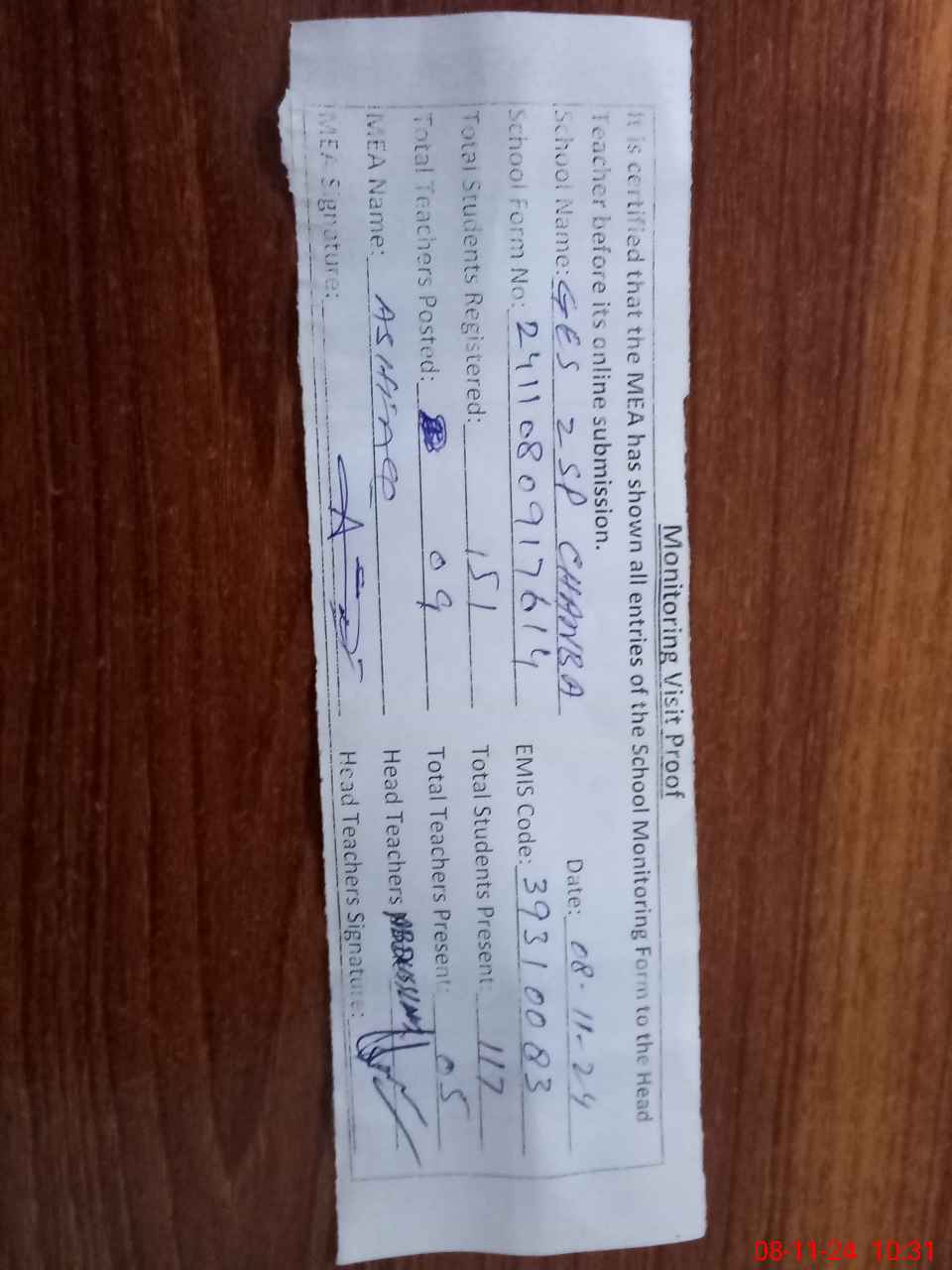 | Attendance Register | Head Teacher | MEA with School | Visit Proof |