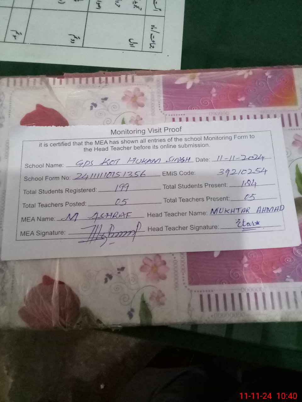 | Certified that this School was Inspected by the Undersigned MEA/DMO Today and the Information Stated Above is as Per Record. | |||||