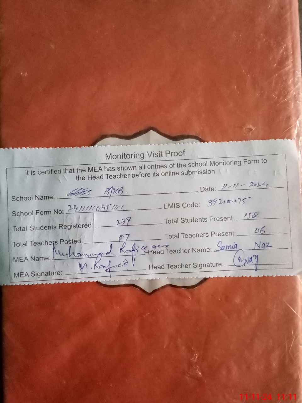 | Attendance Register | Head Teacher | MEA with School | Visit Proof |