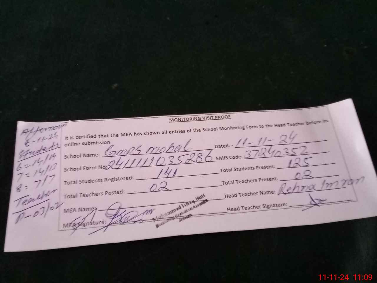 | Attendance Register | Head Teacher | MEA with School | Visit Proof |
