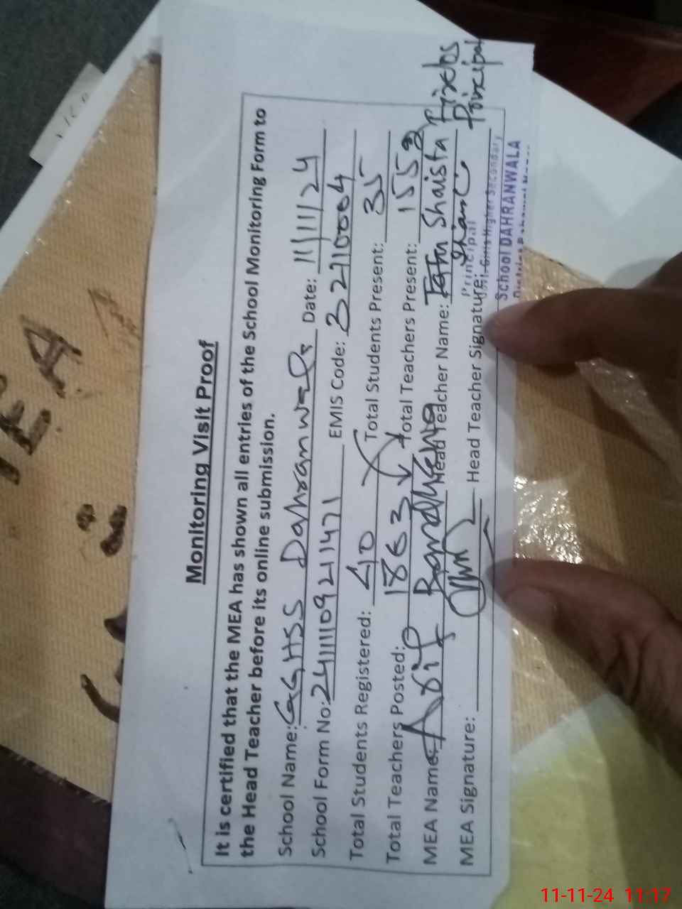 | Attendance Register | Head Teacher | MEA with School | Visit Proof |