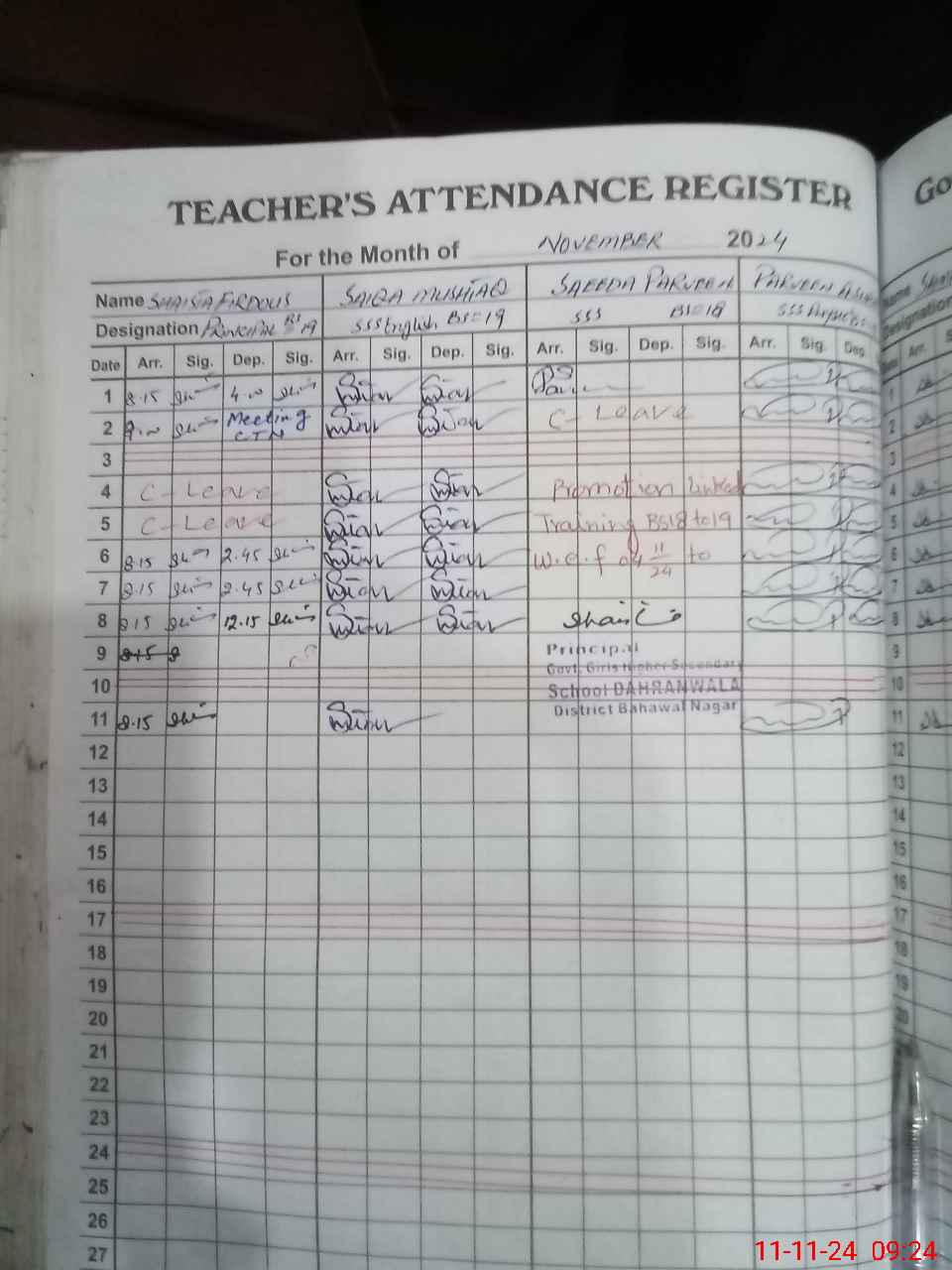 | Remarks (Use Separate Page if Required): Jc M Haseeb is unofficial absent without official leave Leaves of teachers Ranaz Akbar Shahida Younas shamim Akhtar not approved by competent authority Leave of Sidra Basheer rejected by competent authority however said proceeded on leave 2 classes are sitting in branda ECCE class not according to ECCE plan class is sitting in old ECE pattern class mixed with katchi class | |||||
