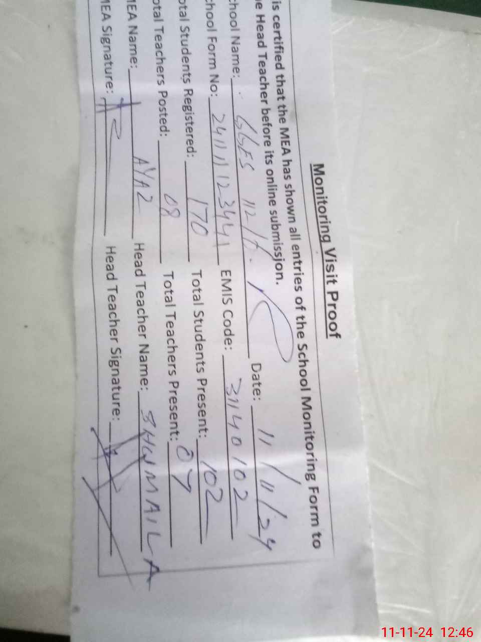 | Attendance Register | Head Teacher | MEA with School | Visit Proof |