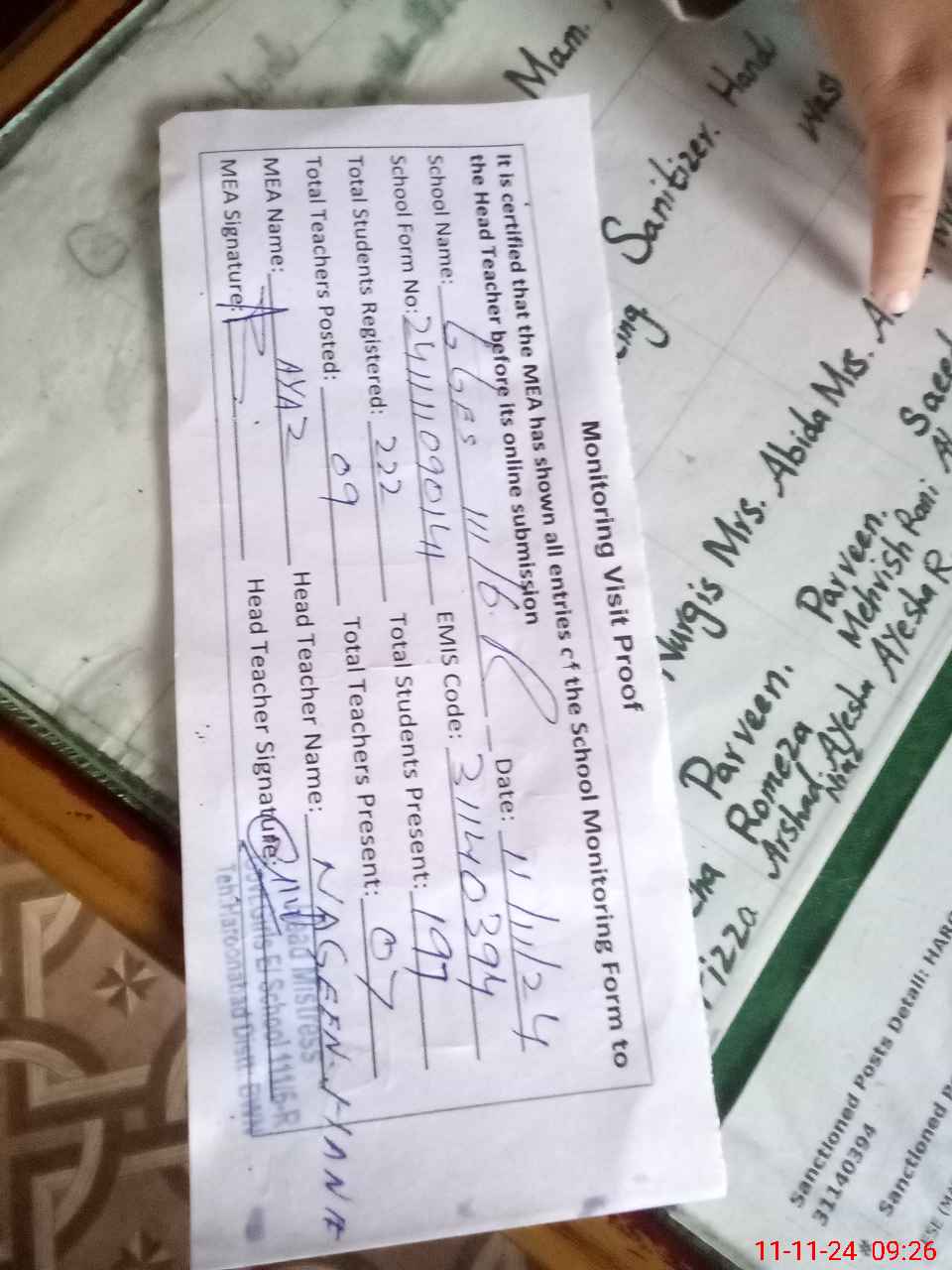 | Attendance Register | Head Teacher | MEA with School | Visit Proof |