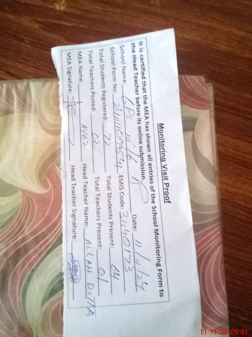| Attendance Register | Head Teacher | MEA with School | Visit Proof |