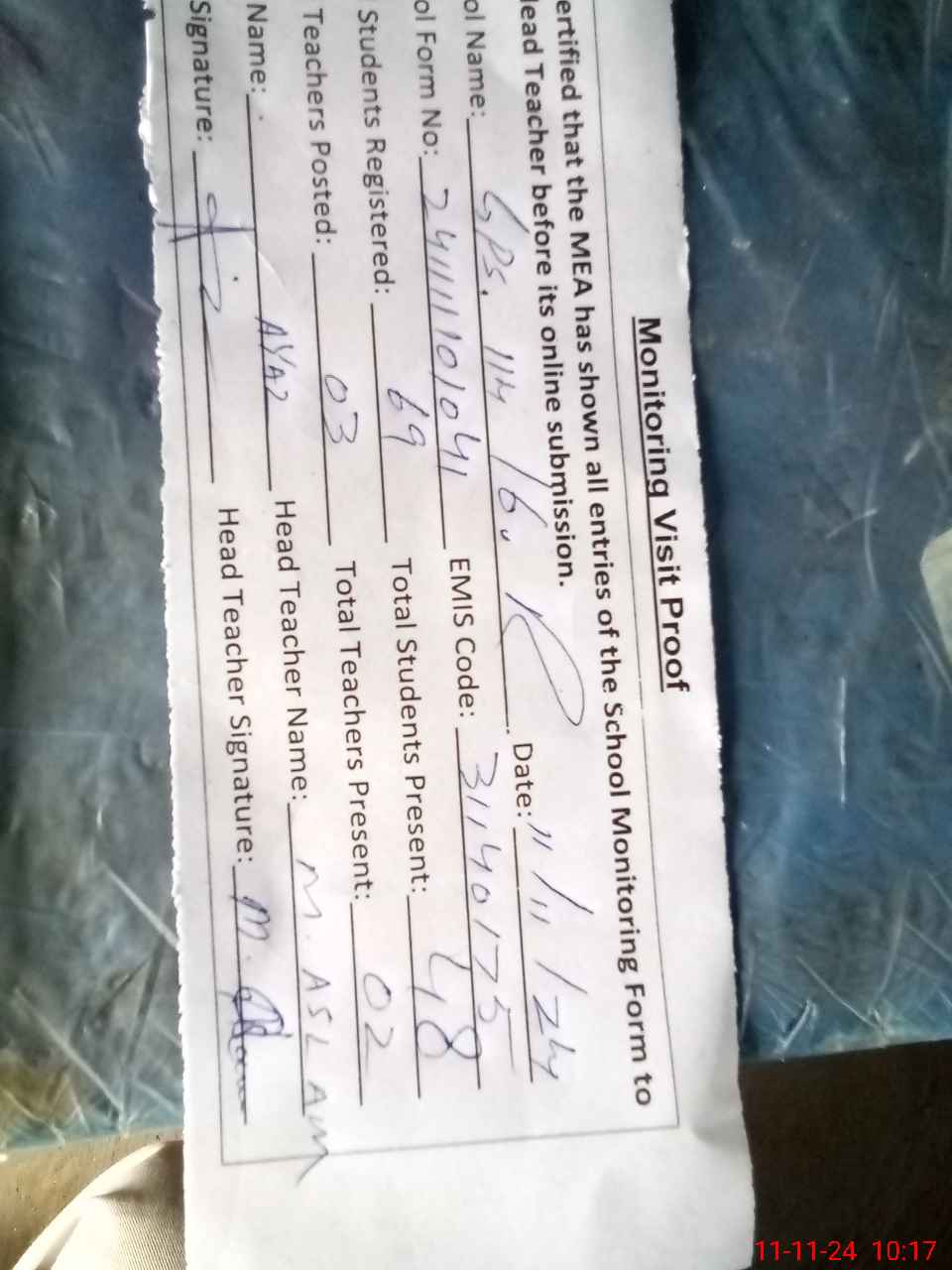 | EMIS Code: 31140175 | Name of School: GPS CHAK NO 114/6-R | |||
