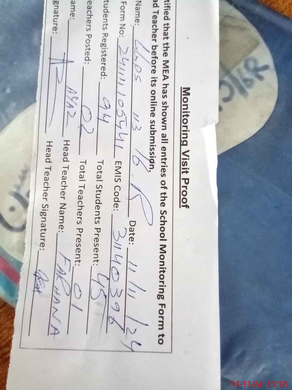 | Attendance Register | Head Teacher | MEA with School | Visit Proof |