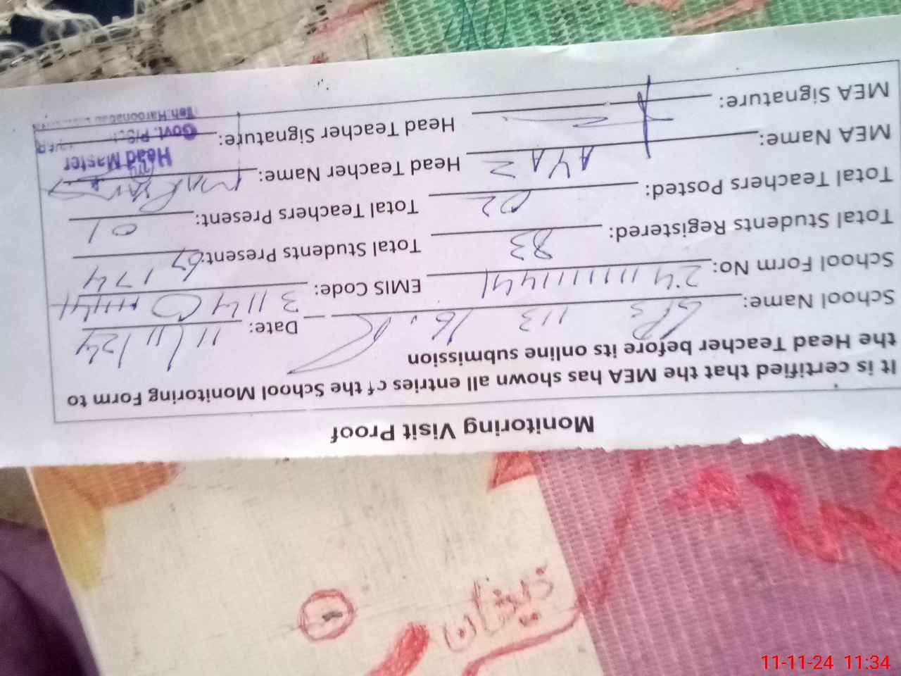 | Attendance Register | Head Teacher | MEA with School | Visit Proof |