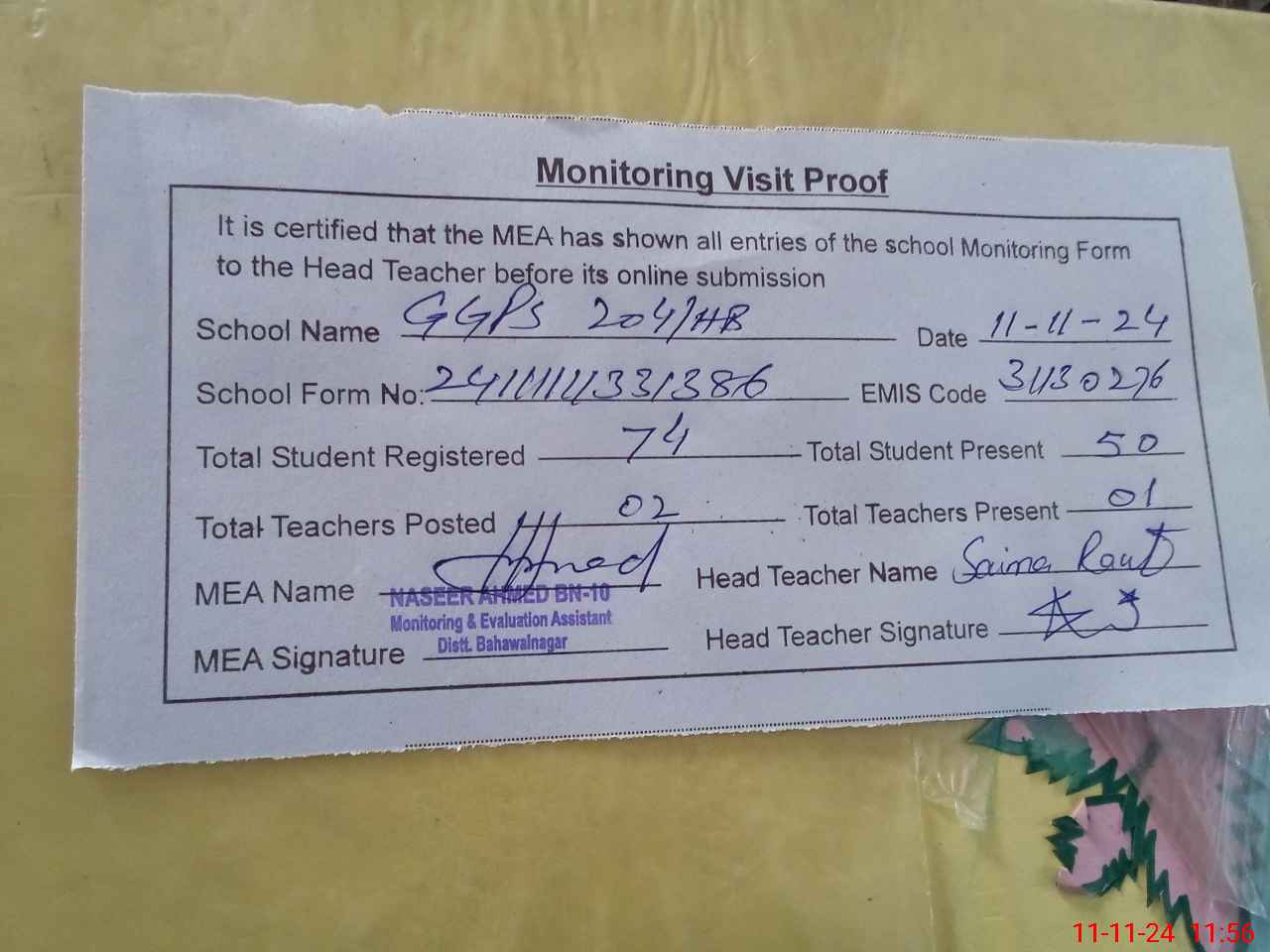 | EMIS Code: 31130276 | Name of School: GGPS CHAK NO 204 HB | |||