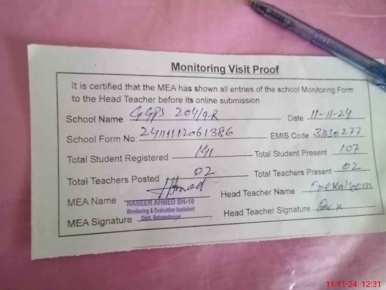 | EMIS Code: 31130277 | Name of School: GGPS CHAK NO. 204/9-R | |||