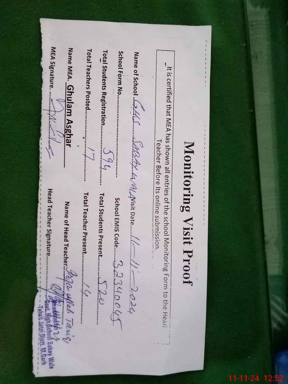 | Attendance Register | Head Teacher | MEA with School | Visit Proof |