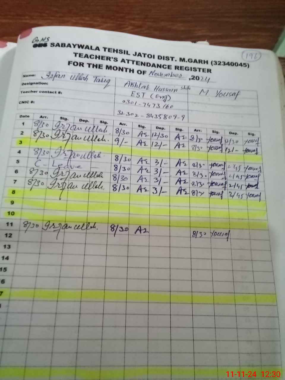 | Name: IR**** UL**** TA**** Designation: (School Headmaster's/Headmistress's) S.S.T.(GEN) Phone/Cell Number: 03**** |