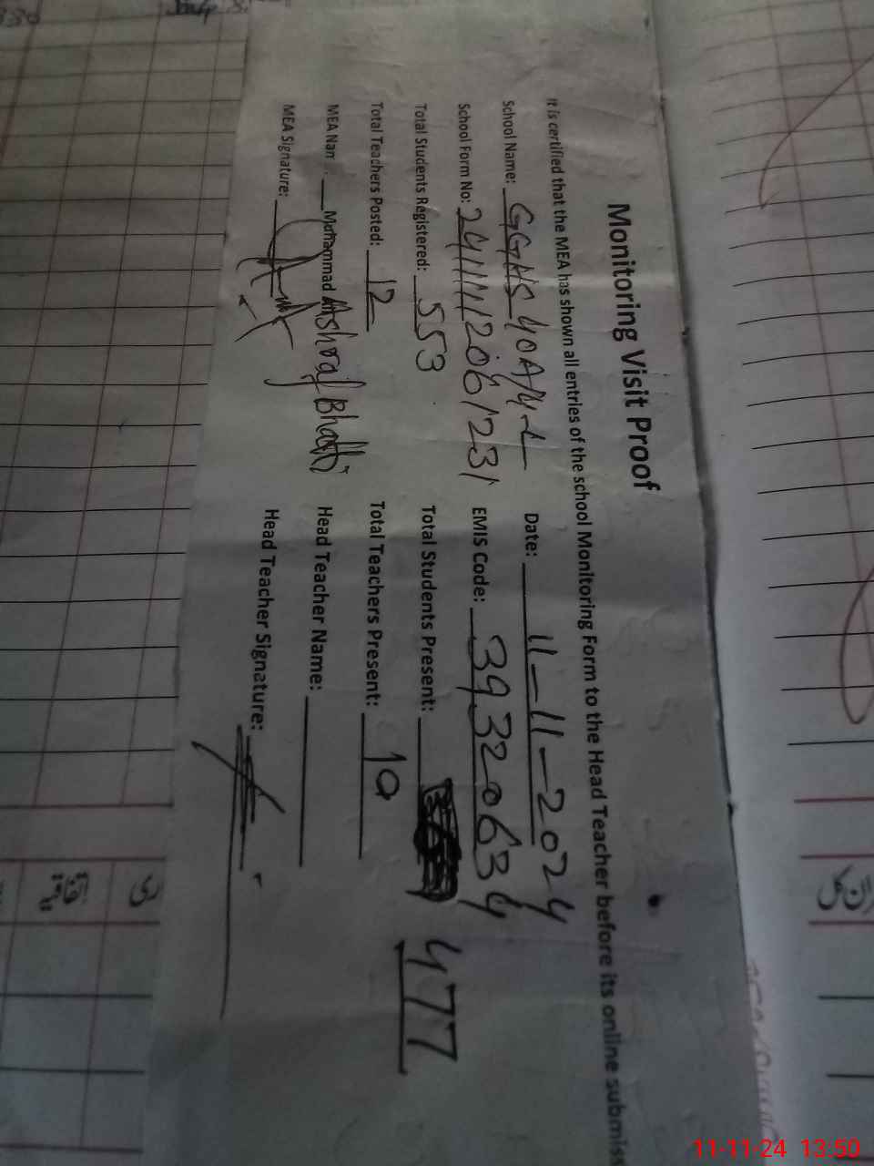 | Attendance Register | Head Teacher | MEA with School | Visit Proof |