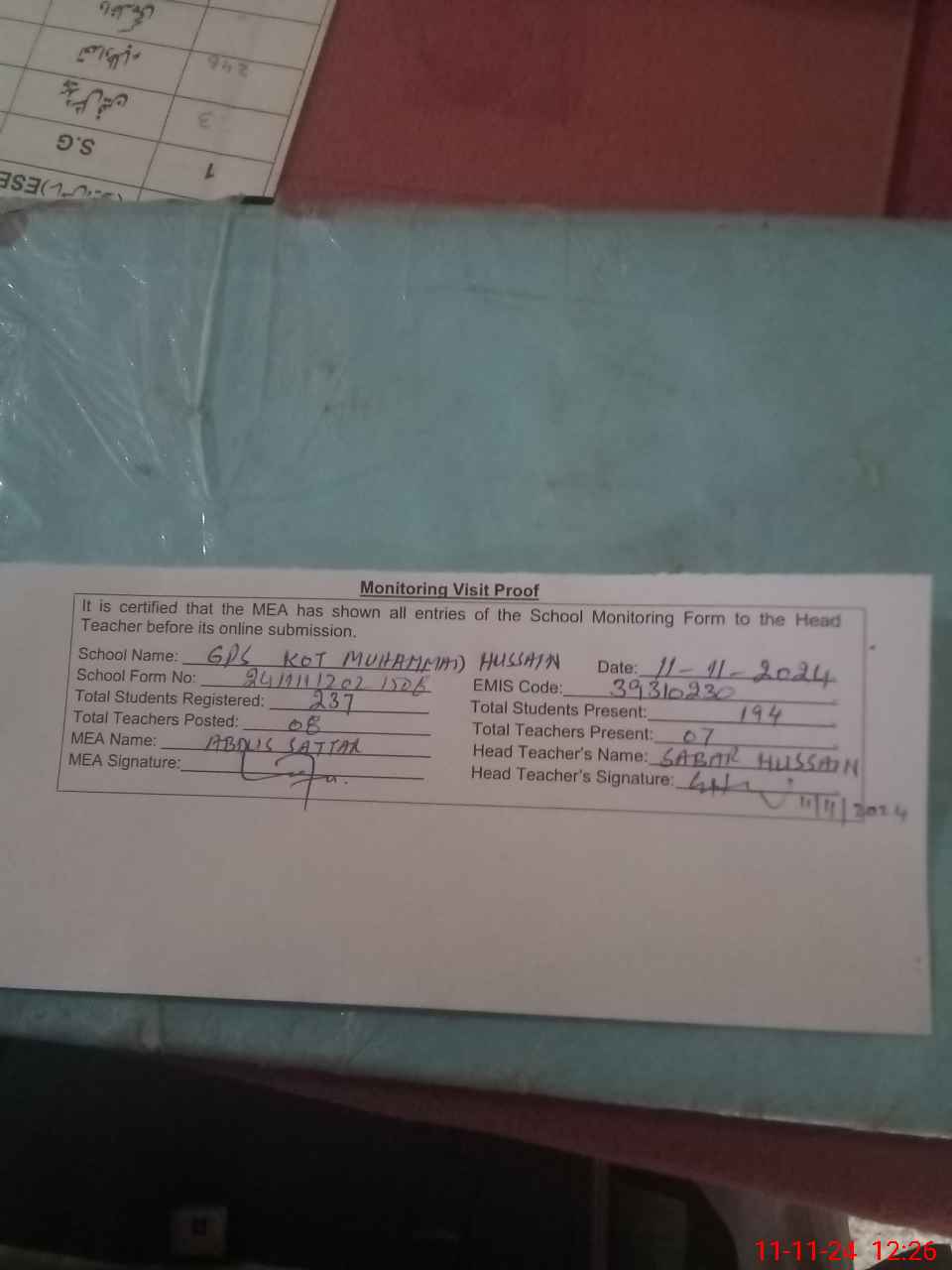 | EMIS Code: 39310230 | Name of School: GPS KOT MUHAMMAD HUSSAIN (HUJRA) | |||