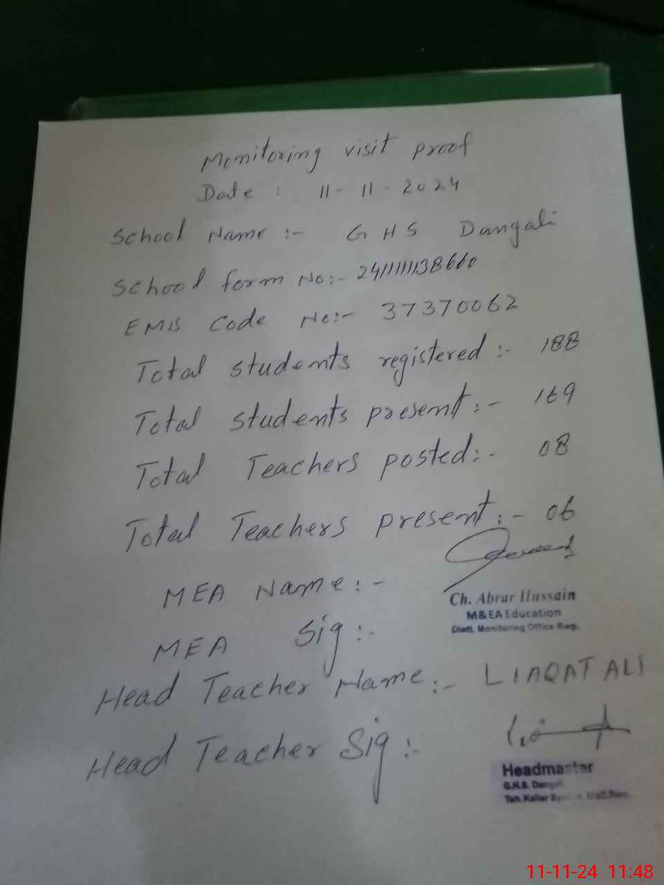 | Attendance Register | Head Teacher | MEA with School | Visit Proof |