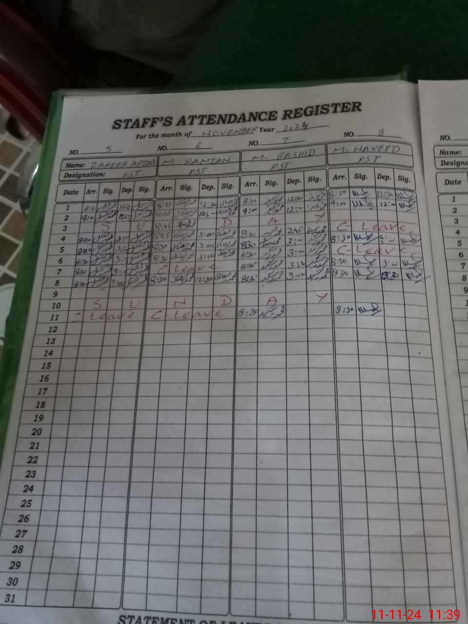 | CNIC | Full Name | Designation | R/C | Absence During Last Calender Month |
