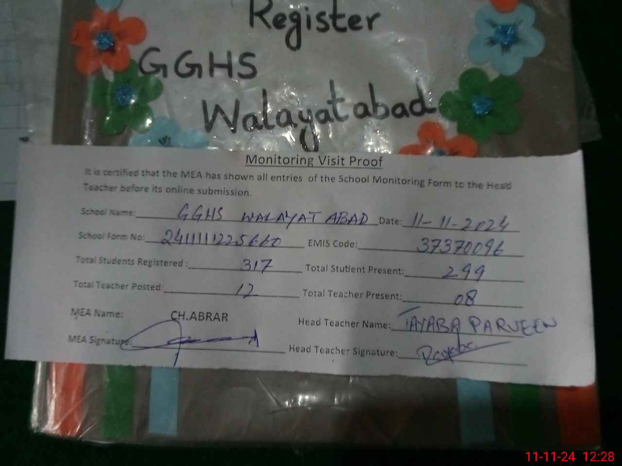 | EMIS Code: 37370096 | Name of School: GGHS WALAYAT ABAD | |||