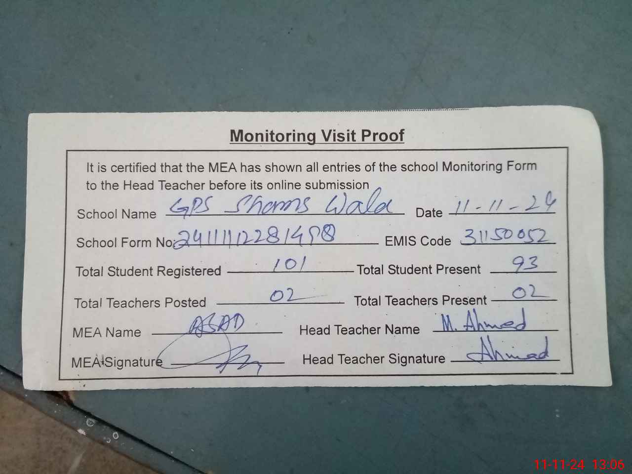 | Attendance Register | Head Teacher | MEA with School | Visit Proof |