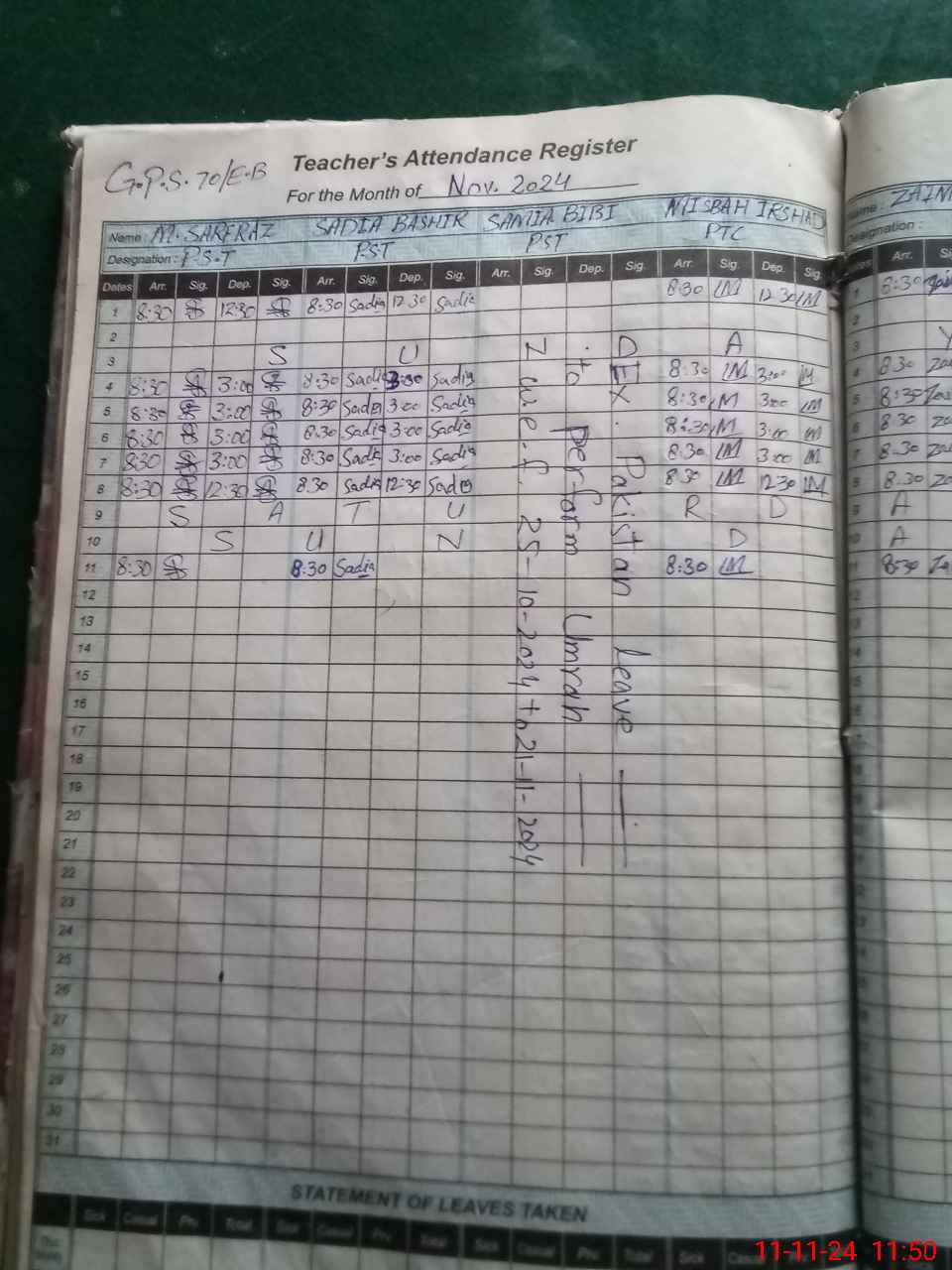 | Leave | Duty | Absent | Maternity | Medical | Ex- Pak |