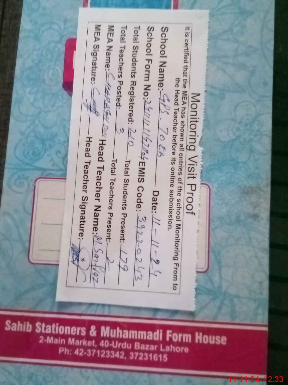 | Attendance Register | Head Teacher | MEA with School | Visit Proof |